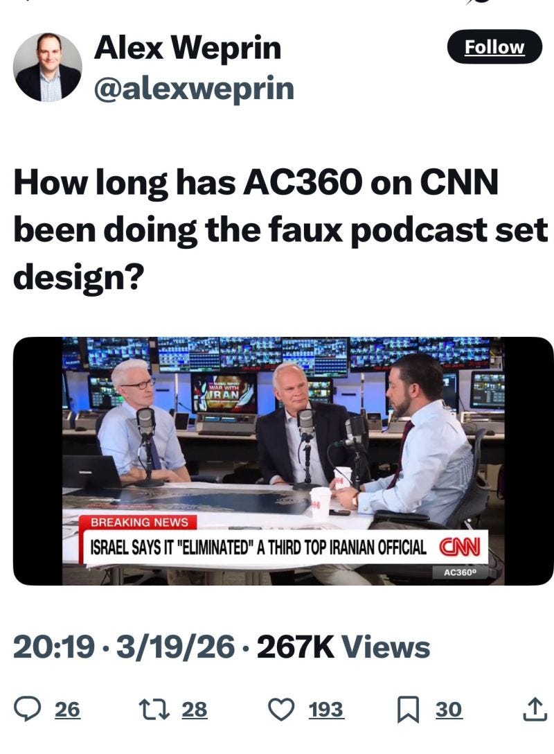 I find myself bemused by CNN this week. They have been cosplaying as podcasts for some reason. Now that podcasts being loosely defined as anything anyone wants it to, we’re doing this with something that is just Anderson Cooper On CNN, and not at all a podcast. This is just the 8pm hour on Cable News Network. But hey, sleeves rolled up, cool microphone on the desk, a laptop, coffee cup….we’re just podcasters like you!