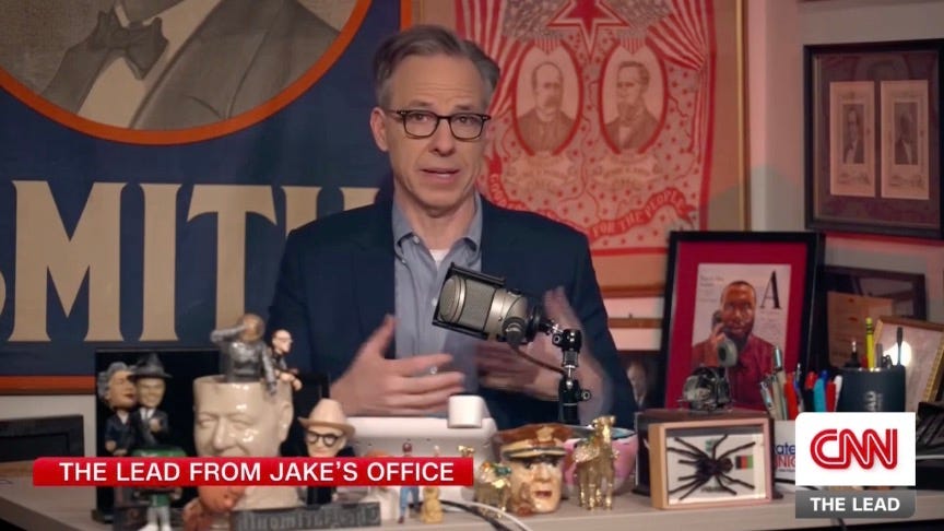 Jake Tapper did the show from “his office.” Maybe this is actually his office and this is actually how his office normally looks. I don’t know, I have never been in his office. He has the prop microphone, but no visible headphones. Sure, let’s all pretend this is a podcast because….cool?